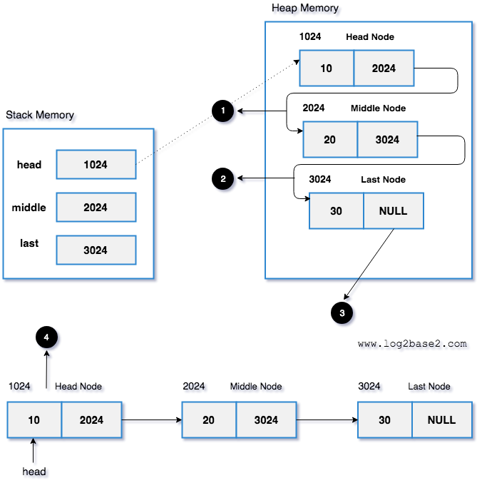 head->next = middle; middle->next = last; last->next = NULL; //NULL indicates the end of the linked list
